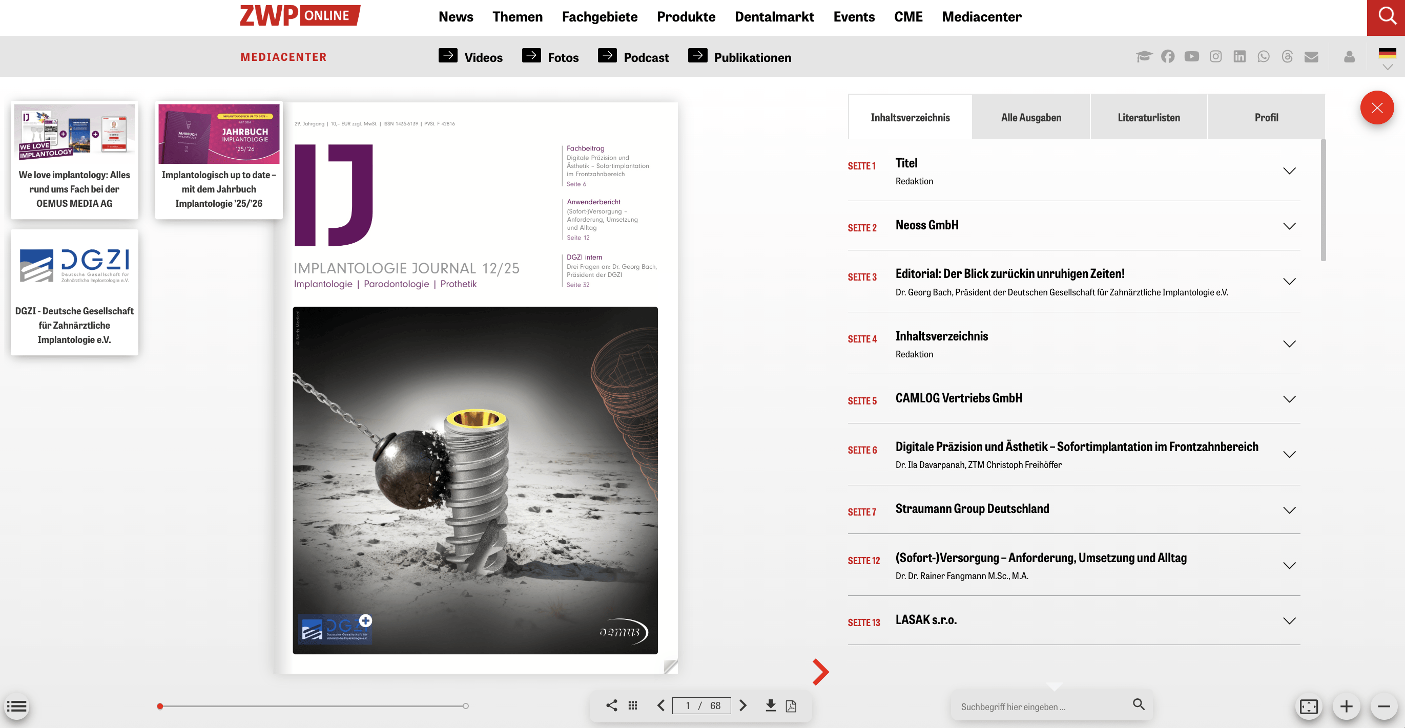 Flankiert wird das Journal von Expertenstatements zum Schwerpunktthema, Einblicken in das Curriculum Implantologie der DGZI durch Vizepräsident Dr. Rolf Vollmer sowie einem Interview mit Prof. Dr. Dr. Eik Schiegnitz, Leiter der Abteilung für Implantologie an der Universitätsmedizin Mainz.