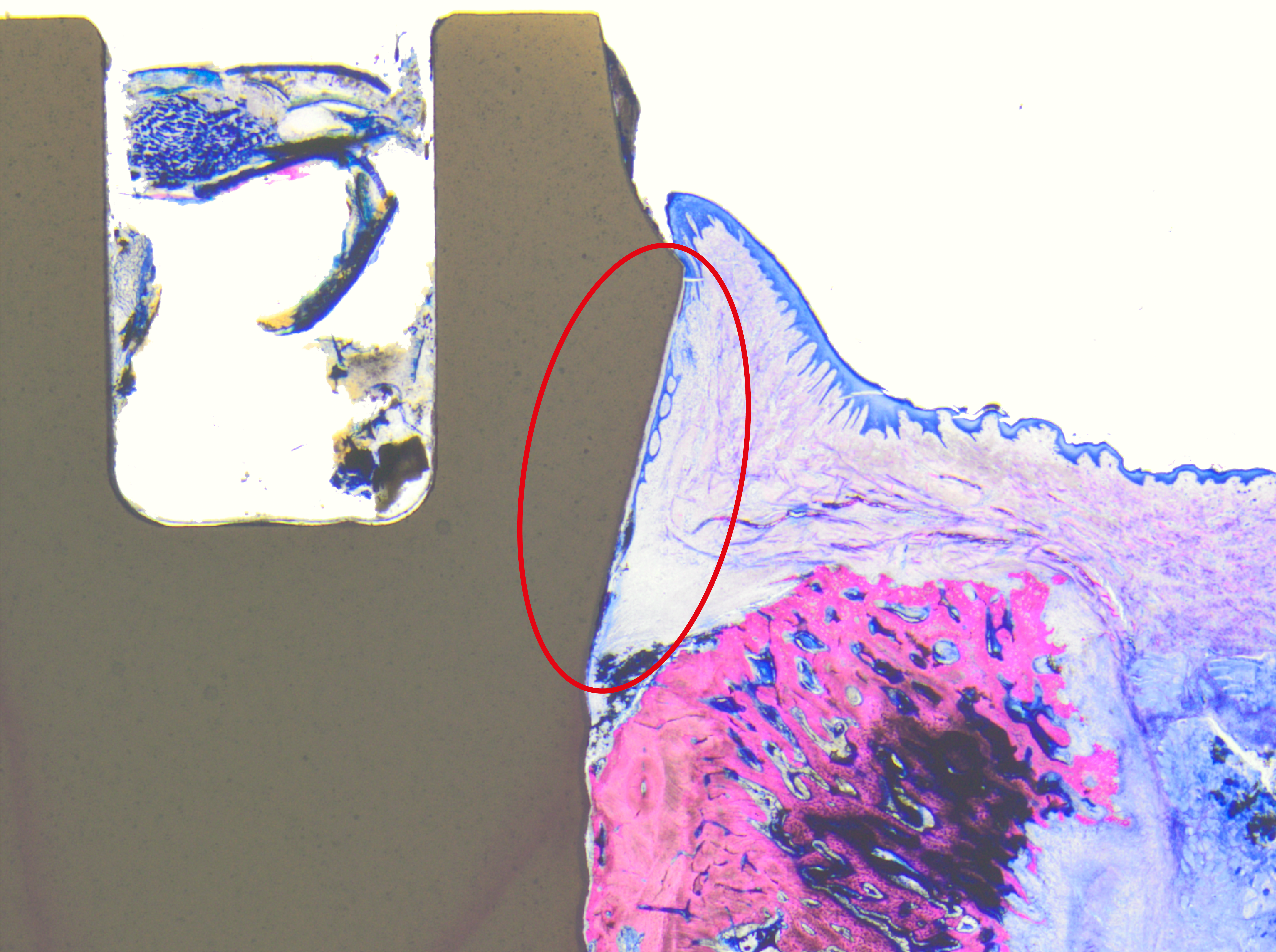 Das Verwachsen von periimplantärem Weichgewebe mit einer synthetischen Oberfläche wurde erstmals beim Patent™ Implantatsystem nachgewiesen. Eine Forschungsgruppe um Prof. Dr. Dr. Anton Sculean, Dr. Peter Schüpbach, Dr. Roland Glauser und Prof. Dr. Dieter Bosshardt belegte diesen neuartigen biomechanischen Verbund in histologischen Studien.