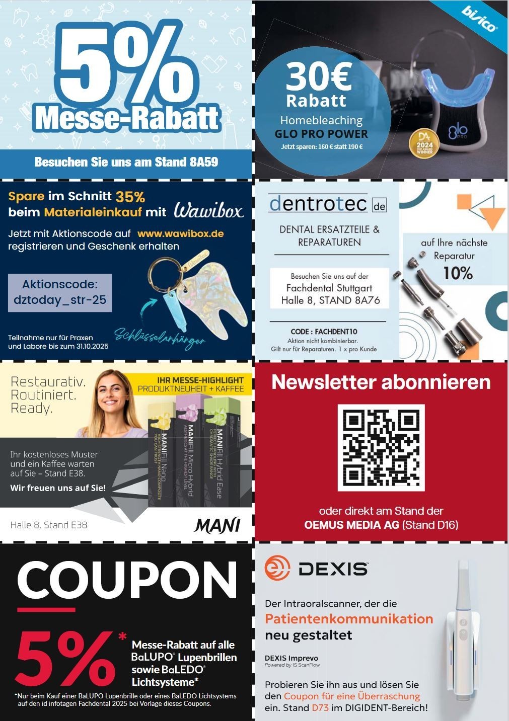 Die Coupons finden Sie auch als Beileger in der gedruckten Messezeitung am Eingang der Fachdental. Wir freuen uns auf Ihren Besuch!