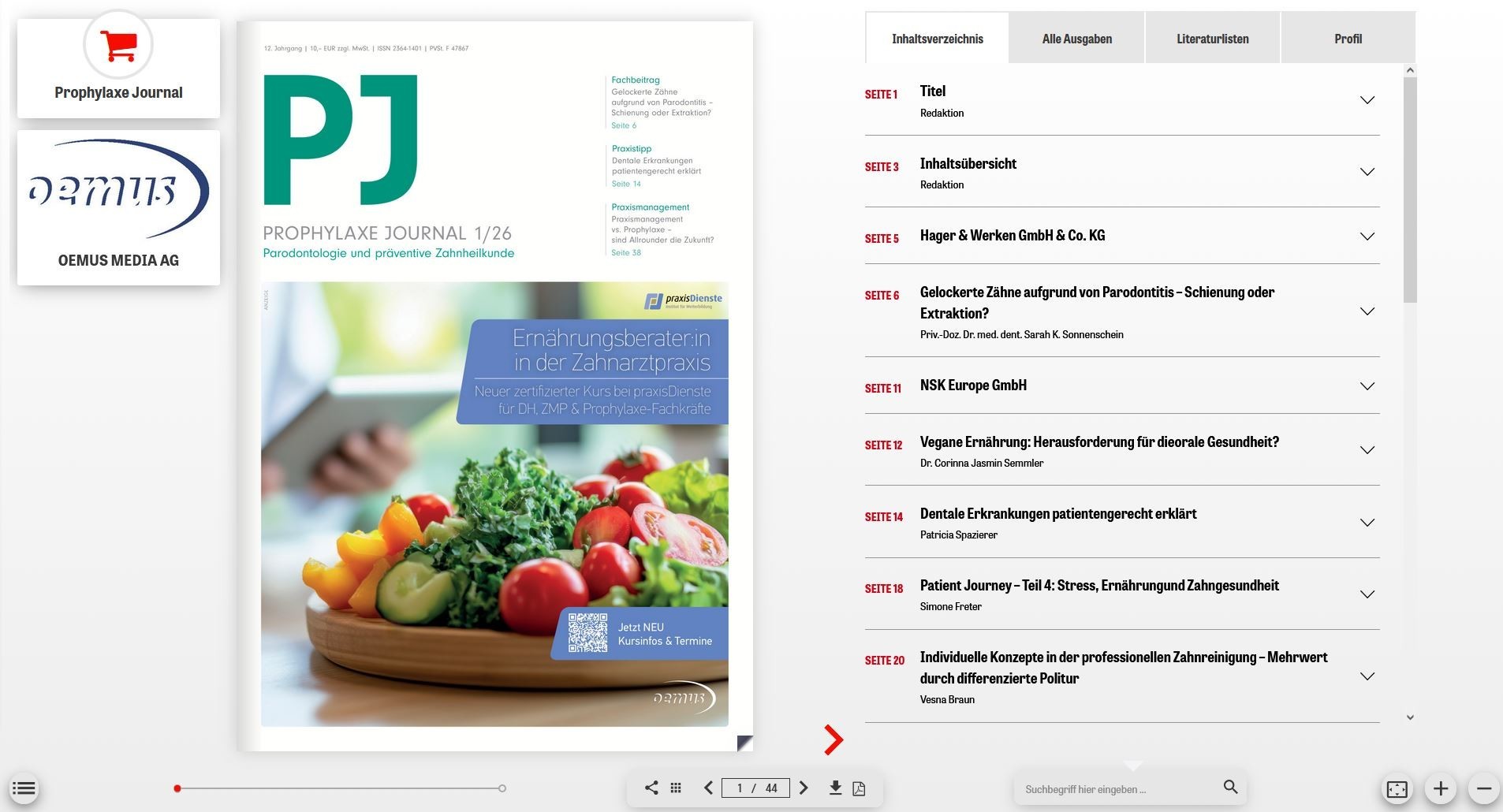 Den Auftakt bildet ein Blick auf den Zahnerhalt bei fortgeschrittener Parodontitis. Stark gelockerte Zähne bedeuten nicht zwangsläufig die Extraktion. Dr. Sarah K. Sonnenschein erläutert, wie sich die Lebensqualität der Betroffenen erhalten lässt. Der Fachbeitrag von Dr. Corinna Jasmin Semmler verdeutlicht, wie eng Ernährung und Mundgesundheit verbunden sind. Am Beispiel der veganen Ernährung wird klar, warum das Thema in Prophylaxe und Beratung zunehmend an Bedeutung gewinnt. Ein weiterer Schlüssel zur erfolgreichen Prävention liegt in der Kommunikation. Patricia Spazierer gibt wertvolle Tipps, wie komplexe dentale Erkrankungen verständlich vermittelt werden können.
