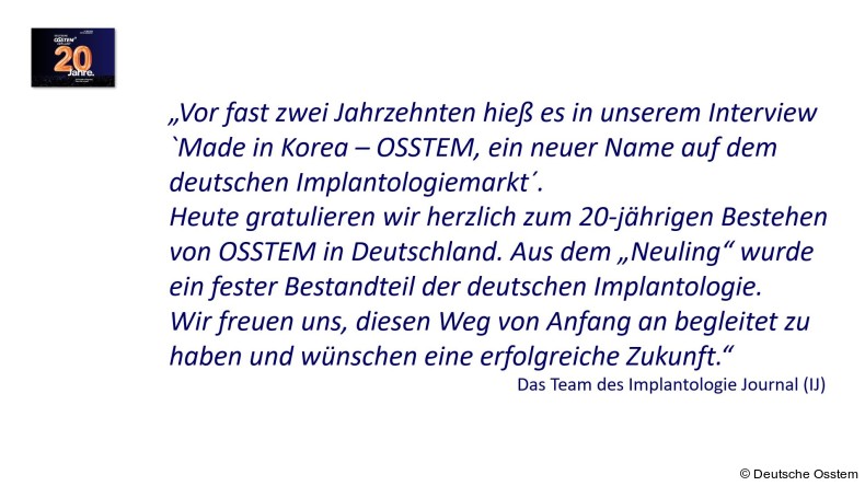 Anlässlich des 20-jährigen Jubiläums von OSSTEM IMPLANT in Deutschland übermittelten viele Weggefährten ihre Glückwünsche, darunter auch das Team des Implantologie Journal, das die langjährige Zusammenarbeit besonders hervorhob. Einen festlichen Moment gab es zudem, als Henrik Eichler vom OEMUS Verlag erstmals das neue Fortbildungskompendium 2025/2026 Jahrbuch Implantologie überreichte, das von den Teilnehmern mit großer Freude entgegengenommen wurde. Bereits 2011 erschien ein Titelcover mit OSSTEM-Implantaten sowie ein Interview mit Gründer Mr. Choi, was die gewachsene Partnerschaft zusätzlich verdeutlichte.