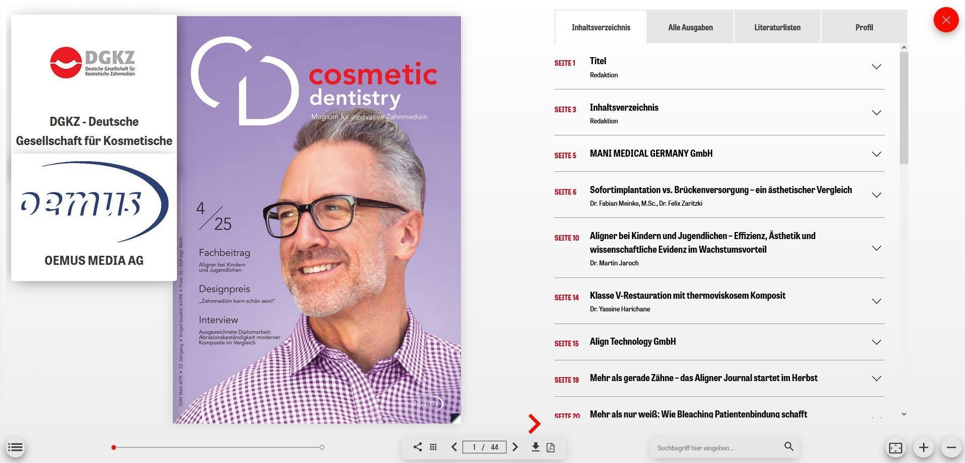 Im Fachteil des Heftes präsentieren Dr. Fabian Meinke, M. Sc., und Dr. Felix Zaritzki das Ergebnis einer ästhetischen Versorgung im Frontzahnbereich, eine präzise geplante Sofortimplantation mit sofortiger Vollkeramikkrone, welche von einem natürlichen Zahn kaum zu unterscheiden ist. Dr. Martin Jaroch widmet sich modernen Aligner-Systemen für Kinder und Jugendliche. Dr. Yassine Harichane führt seine Anwenderbericht-Reihe zu thermoviskosen Kompositen fort und betrachtet diesmal einen Patientenfall mit Klasse V-Kavität. Dabei zeigt er, wie vielseitig das Material sein kann in Bezug auf Formstabilität, Ästhetik und Zeitersparnis. Laurissa Skorianz von der Medizinischen Universität Graz wagt derweil einen Blick in die Zukunft der Füllungstherapie. Im Interview spricht sie über ihre Forschung zu Amalgamalternativen und ihre spannenden Forschungsergebnisse.