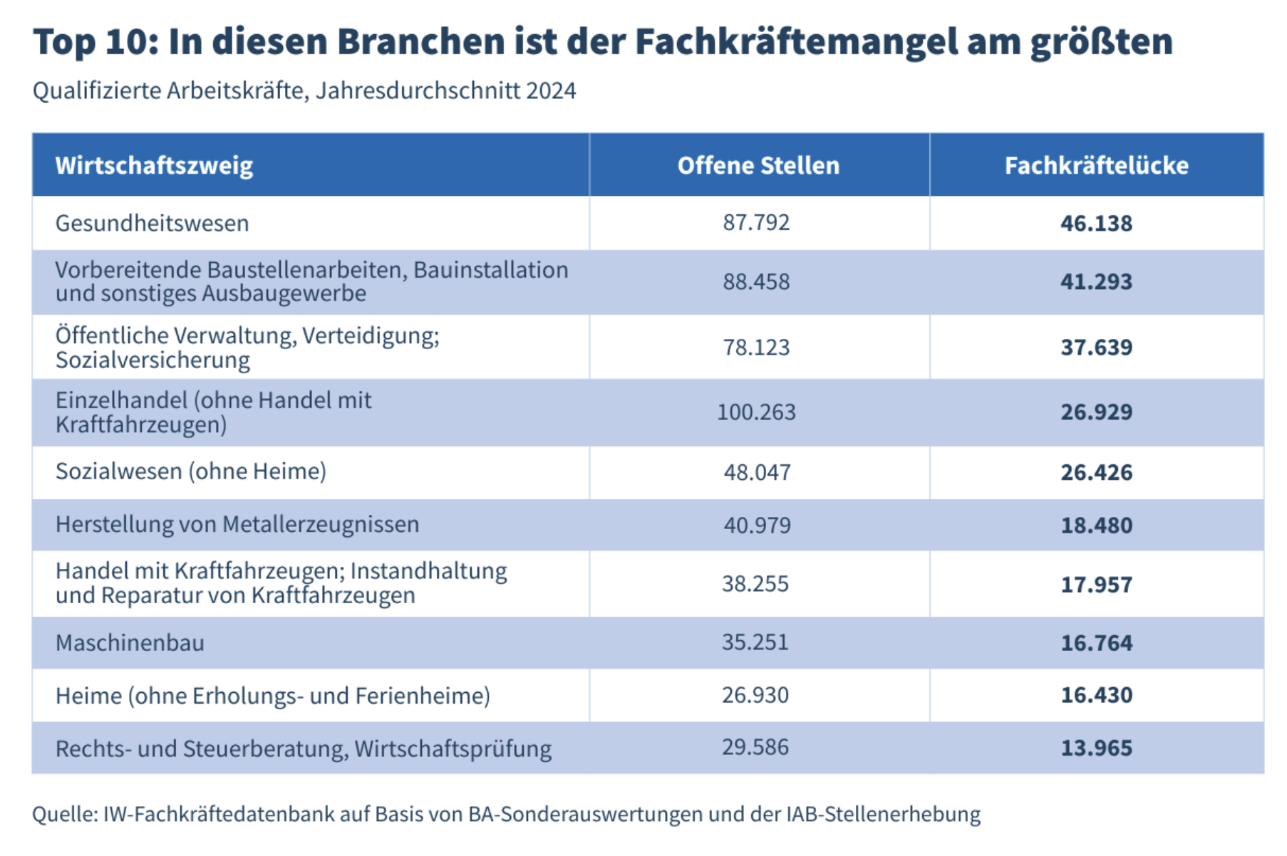 „Zuletzt sind die Fachkräfteengpässe wegen der schwachen Konjunktur zurückgegangen – eine Entwarnung für den Arbeitsmarkt bedeutet das aber nicht“, sagt IW-Expertin Valeria Quispe. Besonders in wichtigen Versorgungsbereichen fehle weiterhin Personal, was auch im Alltag spürbar sei: „Engpässe im Gesundheitswesen führen zu langen Wartezeiten bei Terminen, fehlendes Personal im Baugewerbe bremst den Wohnungsbau“, so Quispe. Gezielte Fachkräftesicherung sei daher unverzichtbar. Dazu gelte es, Beschäftigte ohne Berufsabschluss gezielt für Aus- und Weiterbildung zu gewinnen, stärkere Anreize für ein längeres Erwerbsleben zu setzen und die Zuwanderung qualifizierter Fachkräfte zu fördern.