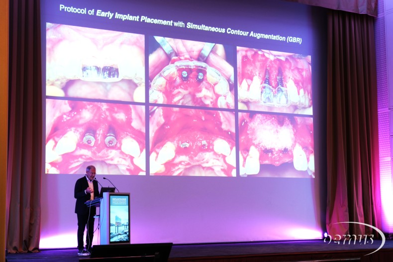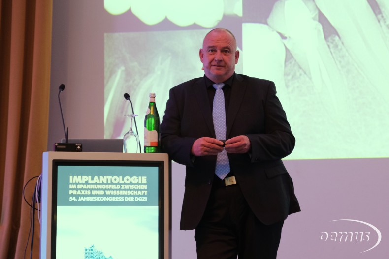 Vom Phänotyp über die Planung und das zur Anwendung kommende Material bis hin zum Protokoll. Seine Ausführungen und Thesen untermauerte Parvini mit zahlreichen klinischen Beispielen. Ein praxisnaher Tipp – „verwenden Sie möglichst geringe Implantatdurchmesser, denn breite verursachen Knochen- und Volumenverlust sowie Resorption!“ Dr. Stefan Reinhardt stellte seine Langzeiterfahrungen zur „Sofortimplantation und Sofortversorgung im Praxisalltag – Konzept und Erfahrungen aus 15 Jahren“ vor. Um diese zu erreichen, stellte Reinhardt folgende Forderungen auf: „1,5mm subkrestal der vestibulären Knochenlamelle ist die ideale vertikale Position für ein Sofortimplantat“, so der Münsteraner Implantologe. Die ideale Distanz des Spalts zwischen Implantat und bukkaler Lamelle ist bei 2–3 Millimetern zu suchen. Um einen direkten Kontakt von Implantat zu Knochenersatzmaterial zu vermeiden, verwendet Kollege Reinhardt Eigenknochen, und dann erst kommt das Knochenersatzmaterial zum Einsatz. In einigen Details unterscheidet sich das von ihm angewandte Prozedere vom allgemein konsentierten.