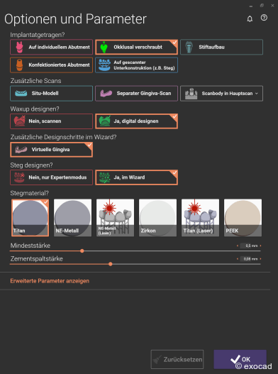 Beim Anlegen des Falls in DentalDB können die Anwender zudem bereits die Parameter für das Stegdesign auswählen, etwa das Stegmaterial. Andere Parameter, wie „Mindeststärke“ oder „Zementspaltstärke“, können hier ebenfalls festgelegt und später im Workflow noch angepasst werden. Alle in dieser Phase gesetzten Parameter und Optionen können gespeichert werden, was die Bearbeitung zukünftiger Fälle mit gleicher Indikation erleichtert.