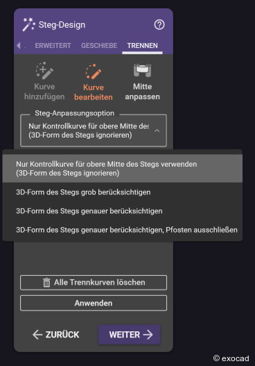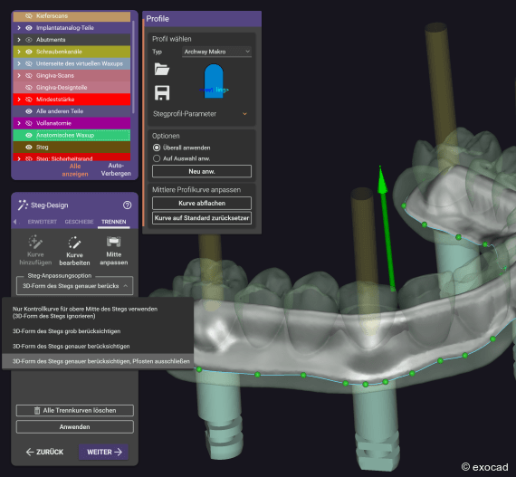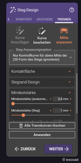 Der Anwender legt lediglich die Trennkurve (Abb. 3) fest, die angibt, an welcher Stelle die Struktur geteilt wird. Anschließend kann aus verschiedenen Optionen zur Steganpassung gewählt werden (Abb. 4). Danach können die Anwender die Parameter anpassen, die Form und Abstand zwischen den beiden Komponenten steuern (Abb. 5). Mit einem Klick auf „Anwenden“ trennt die Software den Steg innerhalb weniger Sekunden automatisch von der Suprastruktur (Abb. 6). Der Steg und die angepasste Suprastruktur können anschließend freigeformt werden (Abb. 7&8).