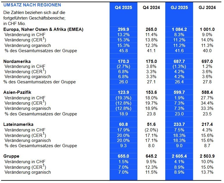Im vierten Quartal 2025 wuchs der Umsatz organisch um 7.0% auf CHF 655.0 Mio. und bestätigte damit die solide operative Dynamik des Geschäfts. Die regionale Entwicklung hob die Stärke und Resilienz des diversifizierten Portfolios der Gruppe hervor. Die Regionen Europa, Naher Osten und Afrika (EMEA) erzielten ein sehr starkes und breit abgestütztes Wachstum, während Nordamerika (NAM) in einem weiterhin herausfordernden makroökonomischen Umfeld eine sehr solide Entwicklung mit sequentieller Verbesserung im Jahresverlauf zeigte. Asien-Pazifik (APAC) ohne China verzeichnete ein solides Wachstum, während der Markt in China in der zweiten Jahreshälfte weiterhin von einem verhaltenen Patientenzulauf und einem vorsichtigen Distributionsverhalten im Vorfeld der nächsten Runde des volumenbasierten Beschaffungsprozesses (VBP 2.0) beeinflusst war. Lateinamerika (LATAM) setzte seine starke Dynamik fort und trug erneut mit einem zweistelligen Umsatzwachstum zum Gruppenergebnis bei.
