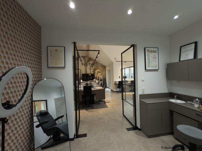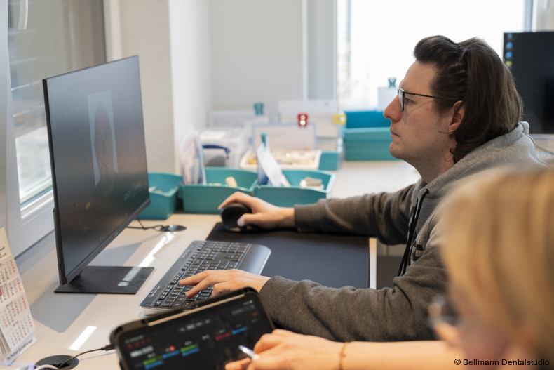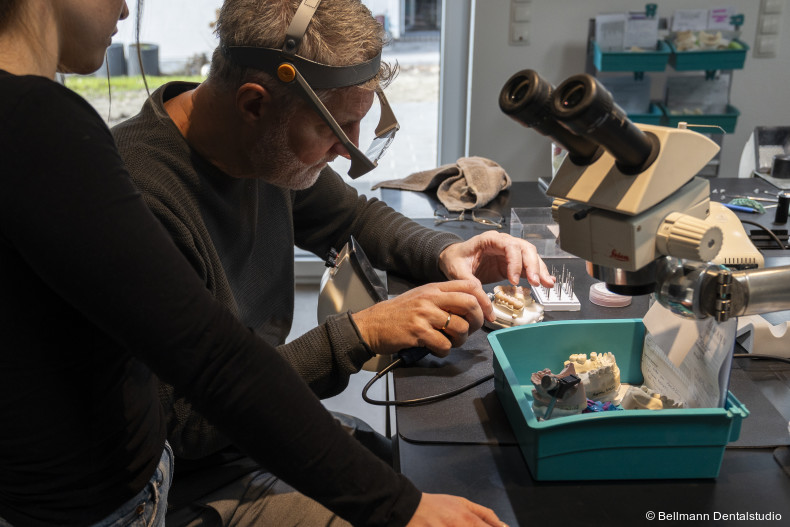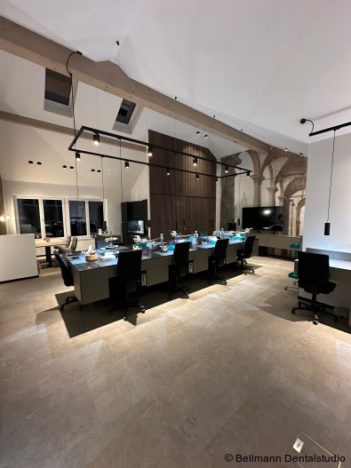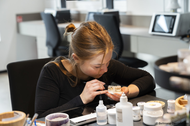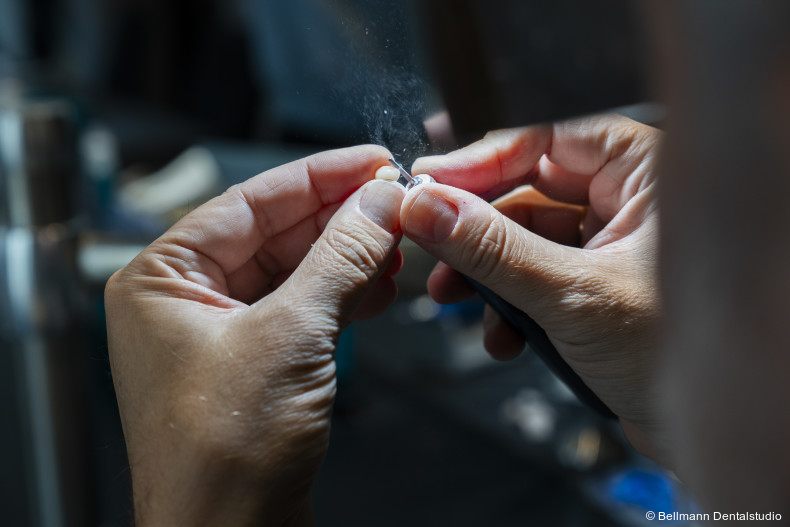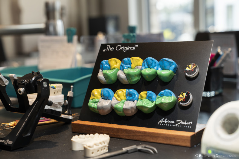 Außerdem haben wir unsere Maschinen in einem Extraraum platziert und für Farbnahmen bei Patienten steht ein spezieller Stuhl bereit. Von diesem aus haben die Patienten einen direkten Blick auf unsere Arbeitsplätze und sehen live, dass wir Handwerk machen. Das soll eine gewisse Professionalität ausstrahlen, damit die Zahnärzte uns auch gern ihre Patienten zur Farbnahme schicken. Mund-zu-Mund-Propaganda sozusagen! (lacht)