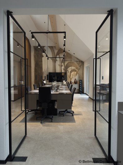 Gleichzeitig machte uns Herr Turley frühzeitig darauf aufmerksam, dass wir durch die hohen Räume unbedingt Akustikpaneele benötigen, um keine Geräuschkulisse wie in einer Kirche zu haben. Die Paneele haben wir an verschiedenen Wänden platziert und das hat sehr gut funktioniert.