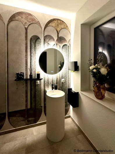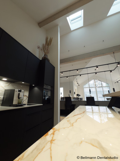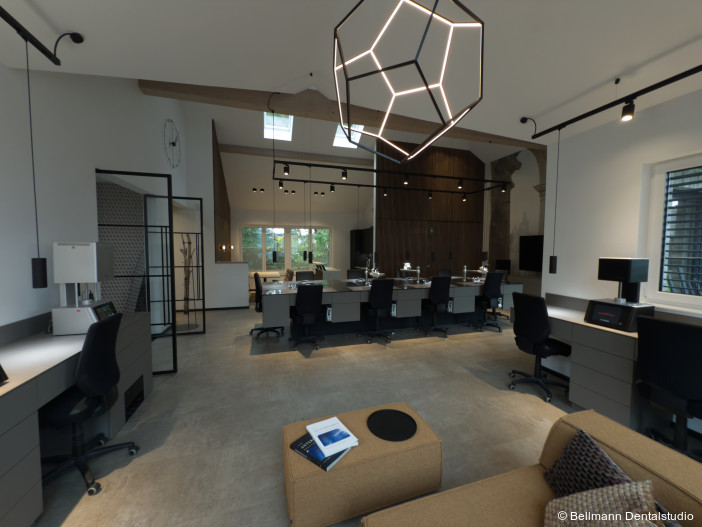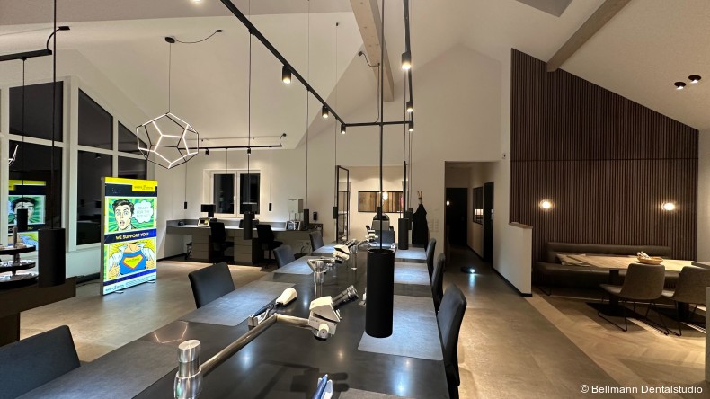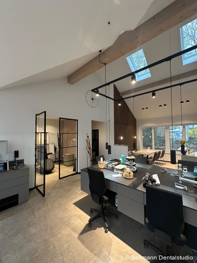 Das Thema Licht! Als Zahntechniker benötigen wir am Arbeitsplatz Tageslicht, doch das Angebot aus dem Dentalbereich hat mich nicht überzeugt – einige empfand ich sogar als optisch störend für das sonst durchdesignte Labor. In meinem Homeoffice hatte ich bereits zwei Jahre mit dem Lampenschienensystem Wever&Ducre experimentiert, dessen Spots einen sehr schönen Arbeitskegel erzeugen. In die Spotleuchten direkt über meinem Arbeitsplatz habe ich Tageslicht integriert, im übrigen Schienensystem Warmlicht – nur Kaltlicht wäre weder den Augen noch der Raumatmosphäre zuträglich gewesen.