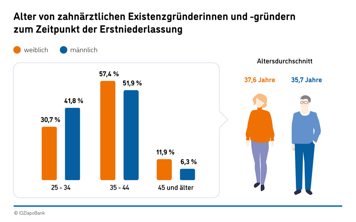 Das Durchschnittsalter der zahnärztlichen Existenzgründer bei der Erstniederlassung betrug 36,6 Jahre (2023: 36,1 Jahre). Die männlichen Existenzgründer waren durchschnittlich 35,7 Jahre (2023: 35,1 Jahre), die weiblichen Existenzgründerinnen im Schnitt 37,6 Jahre (2023: 37,2 Jahre) alt. Die Entscheidung zur Existenzgründung wird heute generell später getroffen als noch vor 30 Jahren. Im Jahr 1995 lag das Durchschnittsalter noch bei 33,6 Jahren1; allerdings gab es damals auch noch nicht die Möglichkeit, vor einer Niederlassung noch über einen gewissen Zeitraum in Anstellung zu arbeiten.