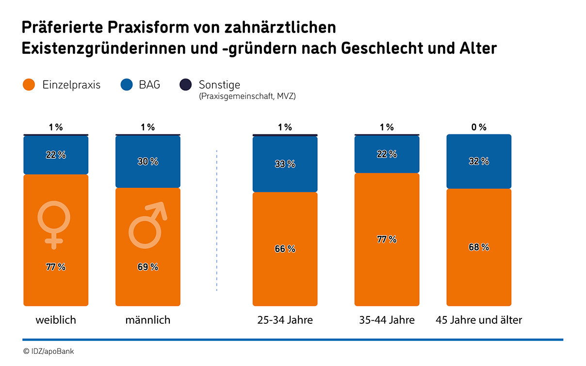Eine zentrale Frage für die Existenzgründerin bzw. den Existenzgründer ist die Wahl der geeigneten Praxisform. Die zahnärztliche Berufsausübung findet ganz überwiegend in den beiden „klassischen“ Formen der Einzelpraxis und der Berufsausübungsgemeinschaft (BAG) statt. Im vorliegenden Datensatz entfallen 72,5 Prozent der Finanzierungsfälle von allgemeinzahnärztlichen Existenzgründungen auf Einzelpraxen und 26,6 Prozent auf Berufsausübungsgemeinschaften. Bei der Vorliebe für eine bestimmte Niederlassungsform bestehen Unterschiede zwischen Frauen und Männern. Während 30 Prozent der Männer die Niederlassung in Form einer BAG präferierten, betrug der Anteil bei den Frauen lediglich 22 Prozent. Auch bei einer Differenzierung nach dem Lebensalter sind Präferenzunterschiede erkennbar. In der mittleren Altersgruppe (25 bis 34 Jahre) entschieden sich knapp 22 Prozent für eine Niederlassung in Form einer BAG, sei es als Neugründung, Übernahme oder Einstieg, während die diesbezüglichen Anteile in den beiden anderen Altersgruppen um etwa zehn Prozentpunkte höher lagen.