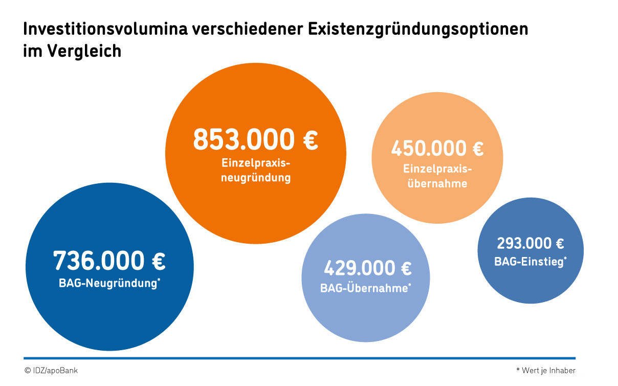 Bei einem Vergleich von Neugründungen und Übernahmen einerseits und Einzelpraxen und Berufsausübungsgemeinschaften andererseits lassen sich unterschiedliche Größenordnungen im Hinblick auf das durchschnittlich benötigte Investitionsvolumen erkennen. Generell sind Neugründungen mit höheren Investitionen verbunden als Übernahmen, und innerhalb dieser beiden Niederlassungsformen ist die Existenzgründung in Form einer Einzelpraxis in der Regel jeweils teurer als eine anteilige Existenzgründung in Form einer Berufsausübungsgemeinschaft.