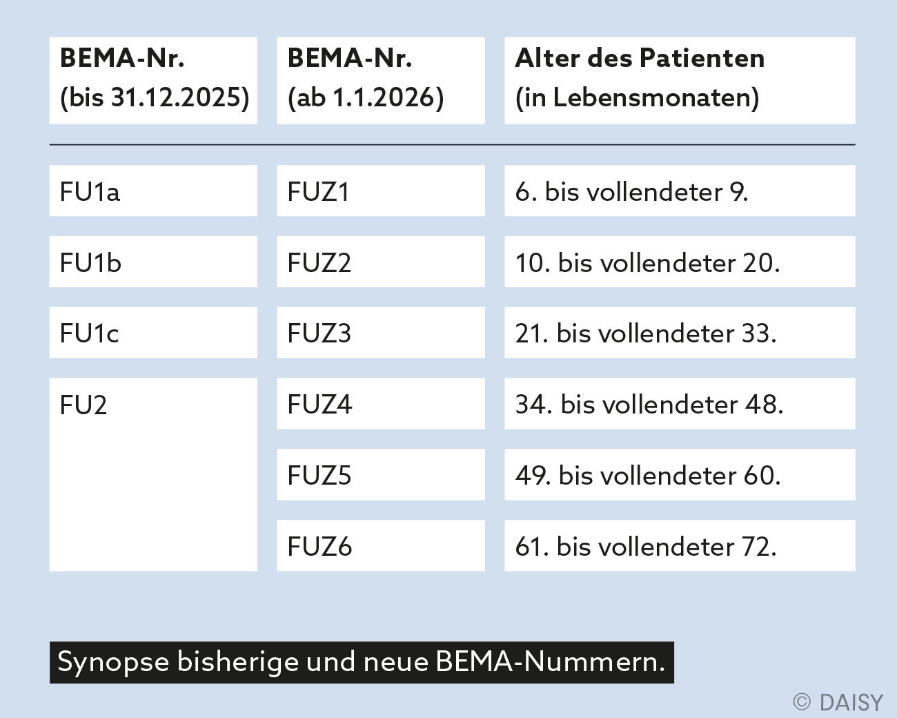 Die Bestimmungen zu den neuen BEMA-Nrn. FUZ1–FUZ6 wurden lediglich um die verpflichtende Dokumentation im Kinderuntersuchungsheft (U-Heft) ergänzt und sind ansonsten weitestgehend identisch mit den bisherigen FU-Leistungen.