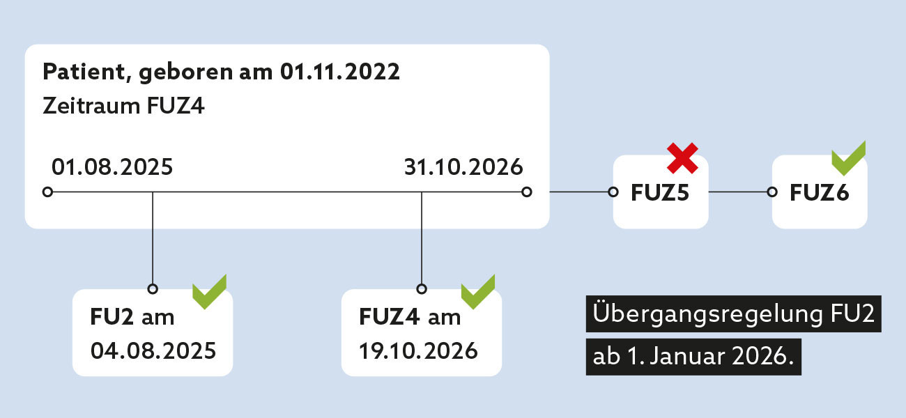 - Übergangsregelungen im Rahmen der bisherigen FU2: Wurde für das Jahr 2026 bereits der zweite FU2-Termin vereinbart und liegt dieser Termin im Zeitraum der neuen FUZ4, so kann dieser Termin nach der FUZ4 abgerechnet werden. Die Abrechnung der FUZ5 entfällt und der letzte FU2-Termin liegt dann im Zeitraum der FUZ6. Eine Abrechnung nach den „alten“ BEMA-FU-Nummern ist im Jahr 2026 nicht mehr möglich.