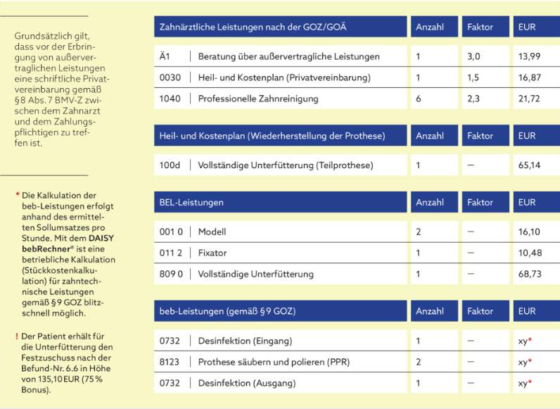 Die vollständige Unterfütterung einer Teilprothese nach der BEMA-Nr. 100d stellt eine Regelversorgung dar und löst auf der Laborrechnung unter anderem die BEL-Nr. 809 0 aus. Durch die zusätzliche Berechnung der Prothesenreinigung (beb-Nr. 8123) und die damit verbundene Desinfektion (beb-Nr. 0732) erfolgt die Einstufung der Wiederherstellungsmaßnahme in diesem Fall als gleichartige Versorgung. Das bedeutet aber nicht, dass Regelversorgungsbestandteile (hier die BEMA-Nr. 100d) nach der GOZ abgerechnet werden.