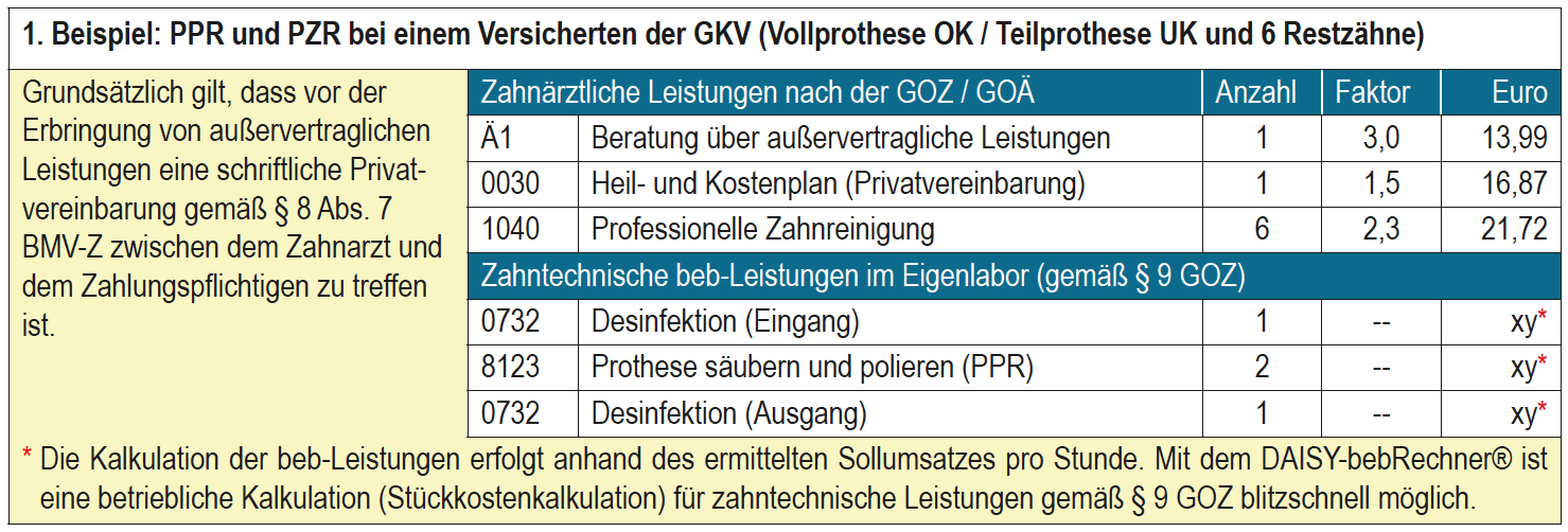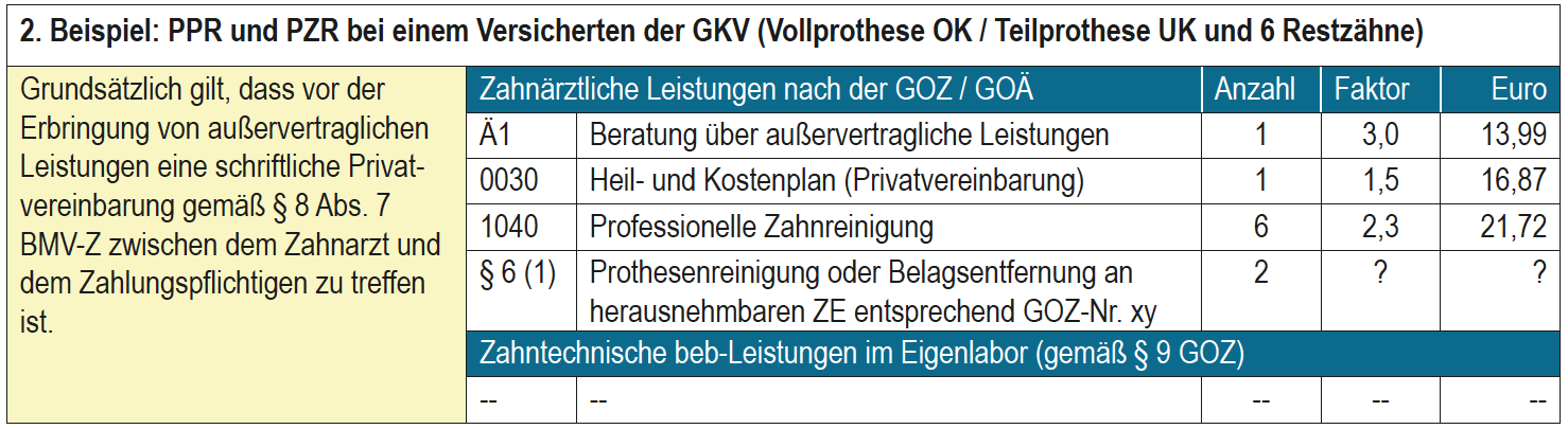 Genau wie die PZR, stellt auch die PPR eine selbstständige Leistung dar, die jedoch weder im BEMA noch im BEL II abgebildet ist und deshalb nicht zulasten einer gesetzlichen Krankenkasse abgerechnet werden kann. Als außervertragliche Leistung (alleinige Leistung oder auch im Zusammenhang mit einer PZR, Wiederherstellungsmaßnahmen etc.) stehen verschiedene Berechnungsmöglichkeiten zur Verfügung: