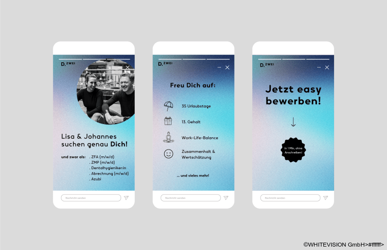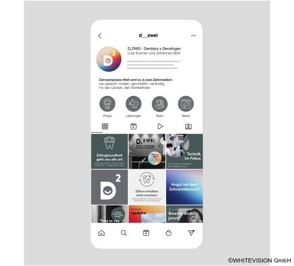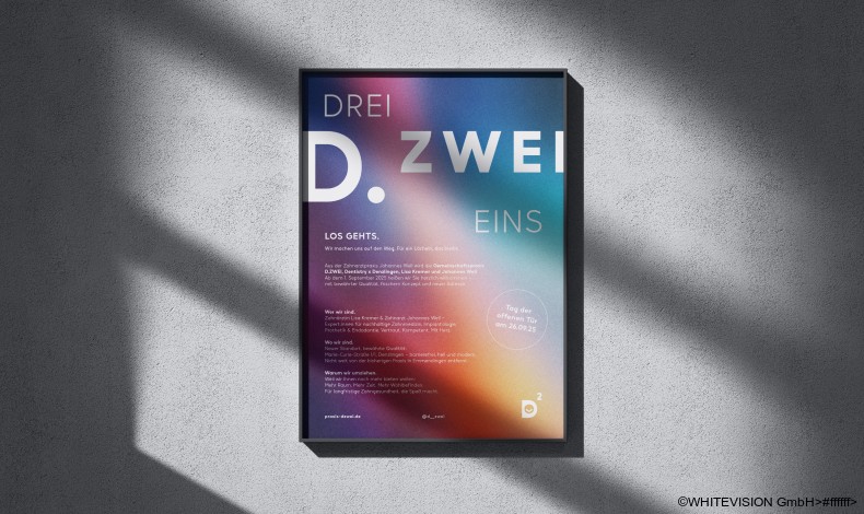 Jens Lichte, WHITEVISION Geschäftsführung/Beratung Weiße Berufe | Praxis: „Mit dem Schritt von der etablierten Einzelpraxis zur Gemeinschaftspraxis D.ZWEI wollten Johannes Well und Lisa Kremer den nächsten Entwicklungsschritt konsequent gehen – fachlich, räumlich und markentechnisch. Unser gemeinsames Ziel: eine WHITEBRAND schaffen, die Kompetenz, Modernität und Menschlichkeit vereint – und im Wettbewerbsumfeld klar differenziert. WHITEVISION hat den Prozess von Beginn an strategisch begleitet: von dem Marken-Workshop, über Naming, Corporate Design, Shooting, Website, Give-aways, Leitsystem, Anzeigen/Plakate bis hin zur räumlichen Markeninszenierung. D.ZWEI steht heute für eine neue Generation von Zahnarztpraxen – klar positioniert, visuell eigenständig und emotional relevant. Eine Praxiswelt mit Charakter – besonders schön, besonders gut, besonders echt.“