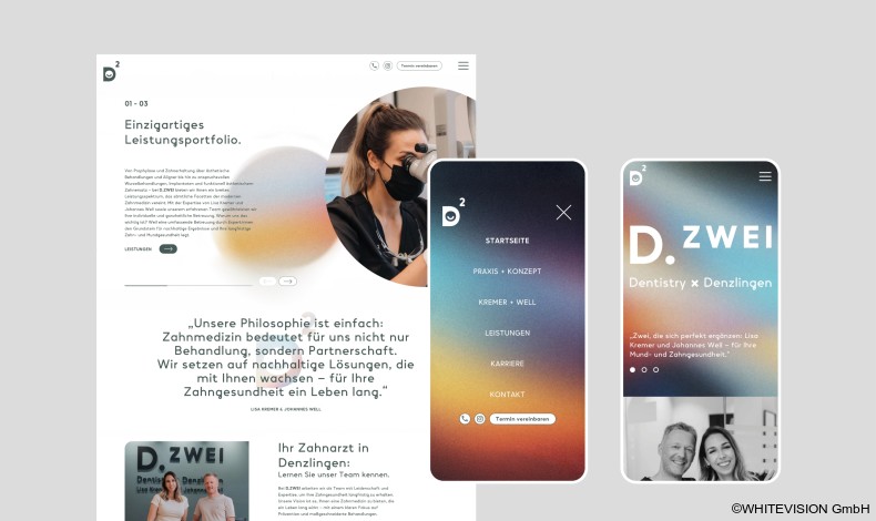 Das Naming D.ZWEI entstand genau daraus: zwei Zahnärzt/-innen, zwei Persönlichkeiten, ein Standort, ein gemeinsames Ziel. Das D steht für Denzlingen × Dentistry – und das Zwei für das Duo. Und auch die Website trifft genau den Puls und zeigt authentisch, wer hinter D.ZWEI steht. Mit modernen Farben, klarer Typografie und einem Design, das auffällt, ohne laut zu sein. Der Internetauftritt ist frisch, zugänglich und ein bisschen anders – genauso, wie die Gründer Zahnmedizin leben wollen: professionell, aber immer mit einem Augenzwinkern und viel Herz.