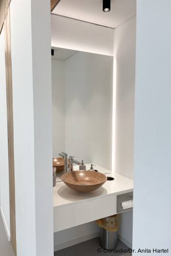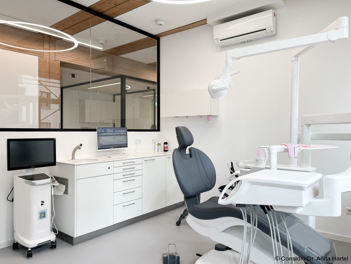 Ein besonderes Highlight der Praxis ist der eigene Mundhygienebereich. Ausgestattet mit einem speziell angefertigten Holzwaschbecken, bietet dieser Raum die Möglichkeit, sich vor oder nach der Behandlung die Zähne zu putzen oder sich kurz frisch zu machen. Besonders bei der Kinderprophylaxe wird dieser Bereich gerne genutzt, um schon früh ein spielerisches und freundliches Bewusstsein für Mundhygiene zu schaffen. Darüber hinaus ist die Praxis technisch auf dem neuesten Stand: Ein 3D-fähiges Röntgengerät sowie ein Intraoralscanner ermöglichen digitale Arbeitsprozesse, die sowohl die Behandlung erleichtern als auch das Erlebnis für die Patienten verbessern.